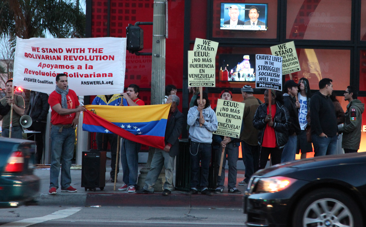 Protestors in front of CNN in Los Angeles call for accurate coverage of the events in Venezuela. Organized by ANSWERLA and the Simon Bolivar Association.